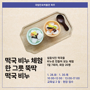 떡국 비누 체험 - '한 그릇 뚝딱 떡국 비누' : 설 음식인 떡국을 비누로 만들어 보는 체험 1일 7회차, 회당 20명 |