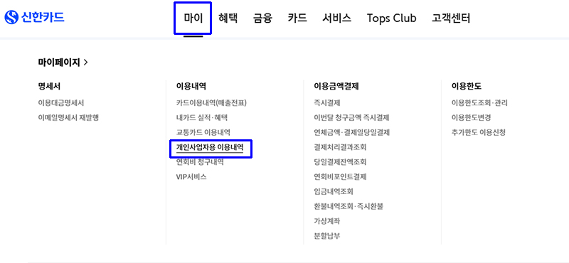 마이 부분의 이용내역 - 개인사업자용 이용내역을 클릭합니다.