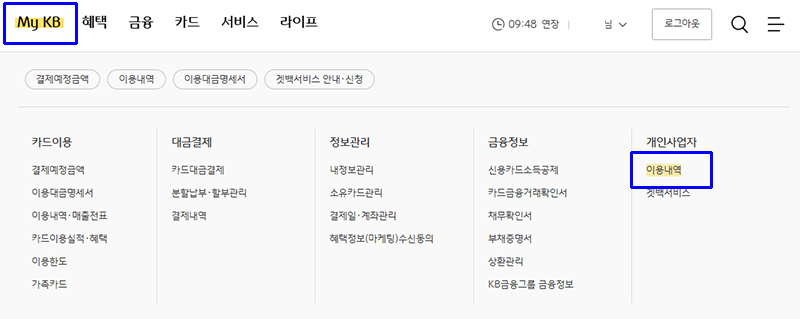 MY KB 부분의 개인사업자 - 이용내역을 선택합니다.