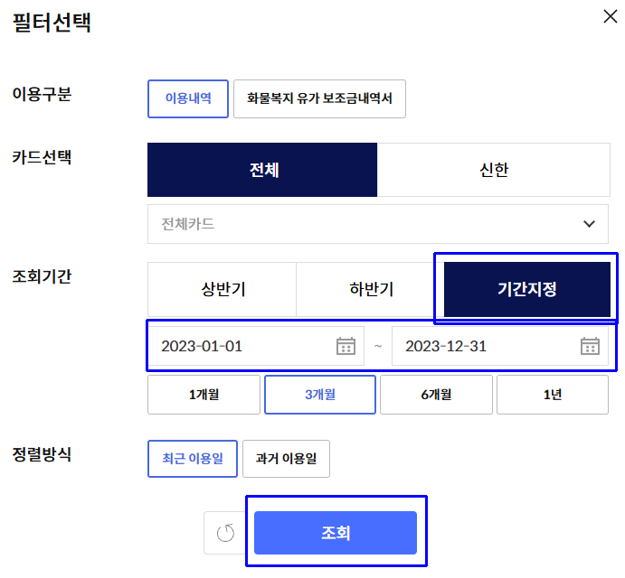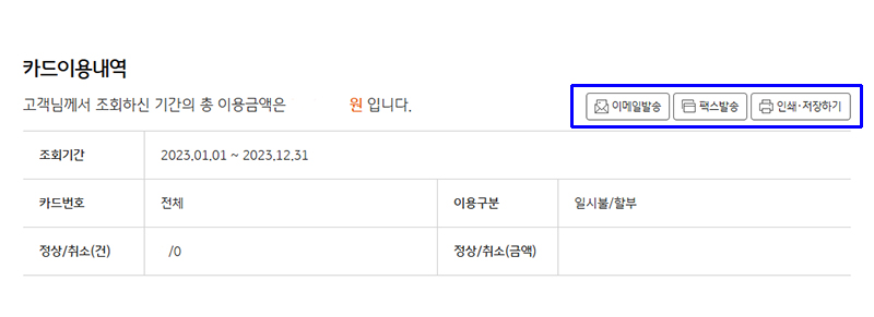 해당기간의 카드 이용내역이 나오는 것을 확인하시고,