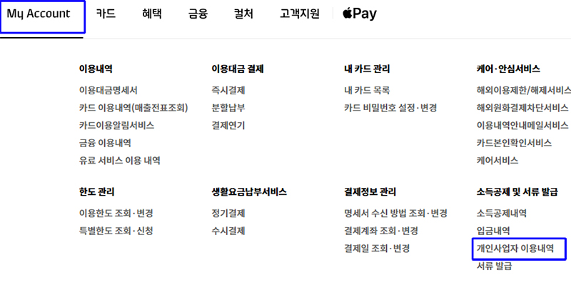 마이BC에 들어간 뒤, 개인사업자이용내역을 선택합니다.