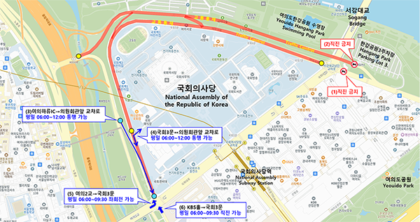 - 전면 통제: 서강대교남단 사거리 ↔ 의원회관 앞 교차로 (4월 6일 12:00 ~ 4월 13일 22:00)