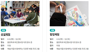 - 상설체험 & 팝업체험: 4월 8일 ~ 12일, 메인 행사장 아트큐브 존. 예술가들과 함께하는 다양한 체험 프로그램.