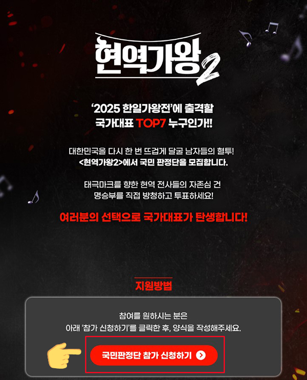 현역가왕2 공식홈페이지👉국민판정단 모집 👉신청하기를 누르시면 방청 모집 안내가 나옵니다.