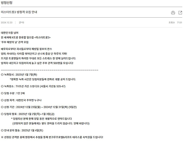 미스터트롯3 공식홈페이지👉시청자참여 👉방청신청을 누르시면 방청객 모집 안내 공지사항이 있습니다.